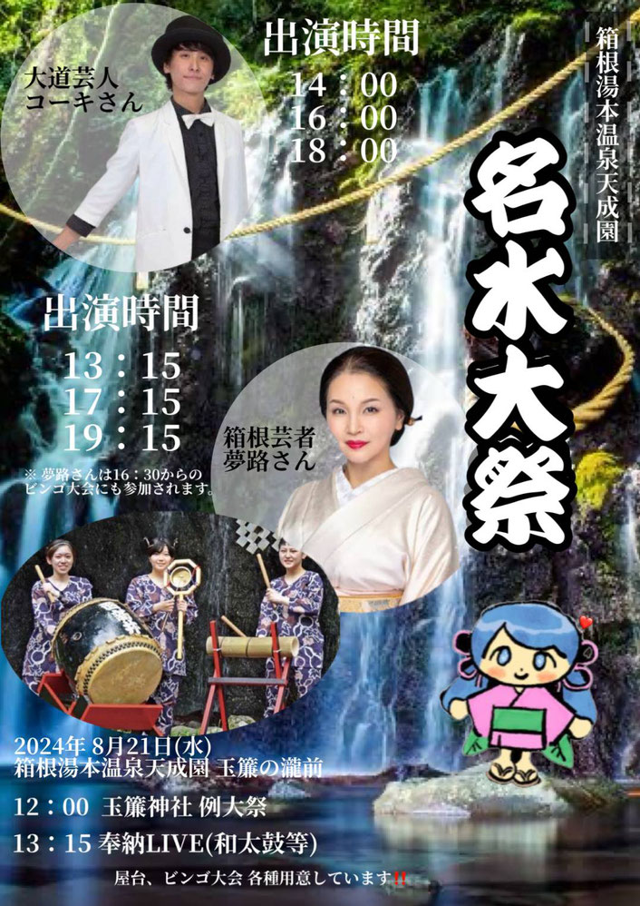 04日 8月 2024 【夢路出演情報】8月21日 箱根 天成園 玉簾の瀧 名水大祭 @天成園 箱根湯本 箱根湯本 天成園「玉簾神社 名水大祭」にて和太鼓と箱根芸者夢路のコラボライブを開催。 日時:2024年 8月21日(水) コラボライブ 第一回 13時15分 ~ 第二回 17時15分 ~ 第三回 19時15分 ~ 場所:天成園 玉簾の瀧前 ※入場無料 tagPlaceholderカテゴリ: コメントをお書きください コメント: 0